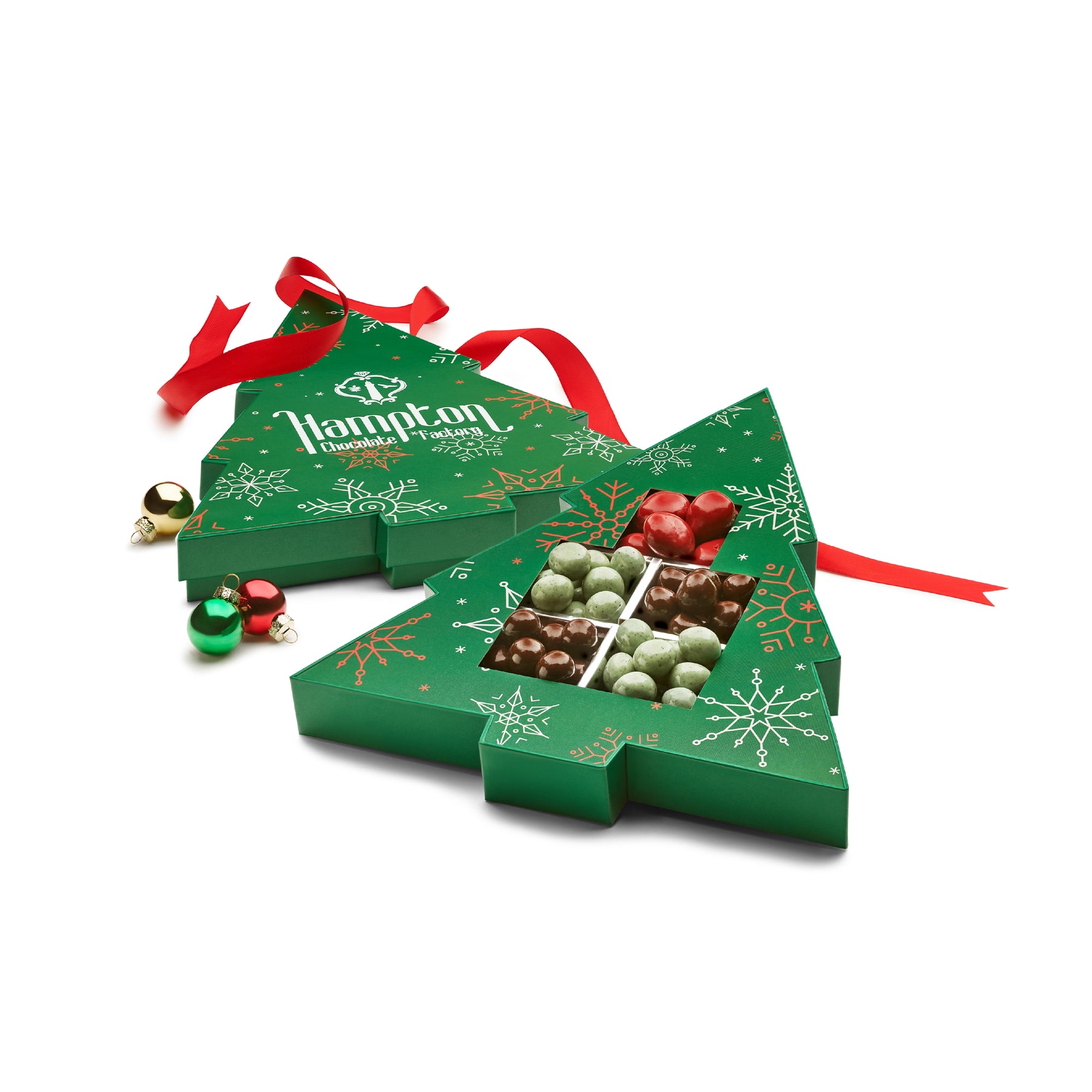 A beautifully crafted, designer tree-shaped gift box filled with festive chocolate favorites Mint Chip Cookies, Pure Chocolate Cherries, and Sea Salt Caramels, all perfectly placed to capture the spirit of the holidays.
